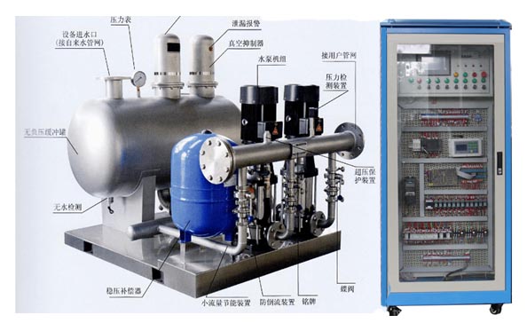 無負(fù)壓供水實訓(xùn)裝置由鋼結(jié)構(gòu)底座、無負(fù)壓罐、控制單元、顯示單元、泵閥等組成。
