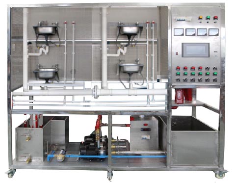 生活給水系統(tǒng)主要有給水箱、給水泵、穩(wěn)壓罐、給水管道、壓力變送器、脈沖水表、水龍頭和淋浴頭等組成。管路采用不銹鋼管進(jìn)行設(shè)計(jì),可進(jìn)行不銹鋼管的切割、安裝和通水試驗(yàn)操作,通過控制系統(tǒng)可實(shí)現(xiàn)生活給水系統(tǒng)的變頻恒壓供水功能,實(shí)現(xiàn)單泵變頻控制或雙泵切換控制等功能;通過脈沖式水表可以完成用水量的計(jì)量。