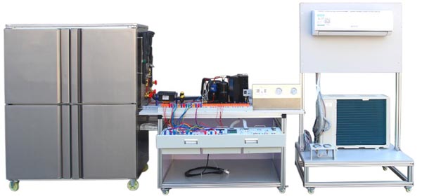 空調(diào)制冷綜合實訓(xùn)裝置主要由空調(diào)器安裝平臺和冷庫機(jī)組、電控系統(tǒng)平臺以及雙溫冷庫柜體三部分組成。